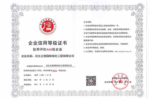我公司本著重合同,守信譽,互惠互利,誠信第一的態度,踏實干事業,契約必踐行的園林宗旨,逐步發展為今天集園林綠化設計及施工、市政工程施工、苗木花卉種植及銷售等綜合性園林綠化行業公司。